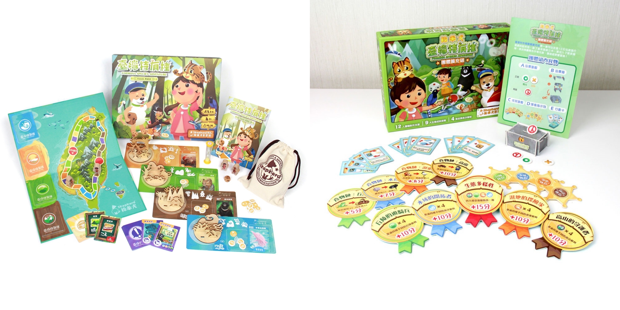 木製遊戲配件、超大型臺灣冒險地圖、60張動物卡與遊戲卡。首賣加贈限量「臺灣植物擴充卡」