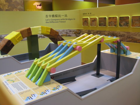 1.當樑木長度越長,所形成的拱形弧度就越小,愈容易讓人車通行,「虹橋」不再是半圓型,長度短且坡度高聳的拱橋!