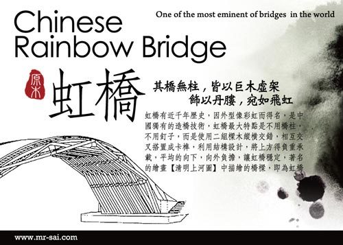 虹橋的歷史悠久已有近千年的歷史,是一種中國獨有的造橋技術,因外型很像是天邊的彩虹而得名。