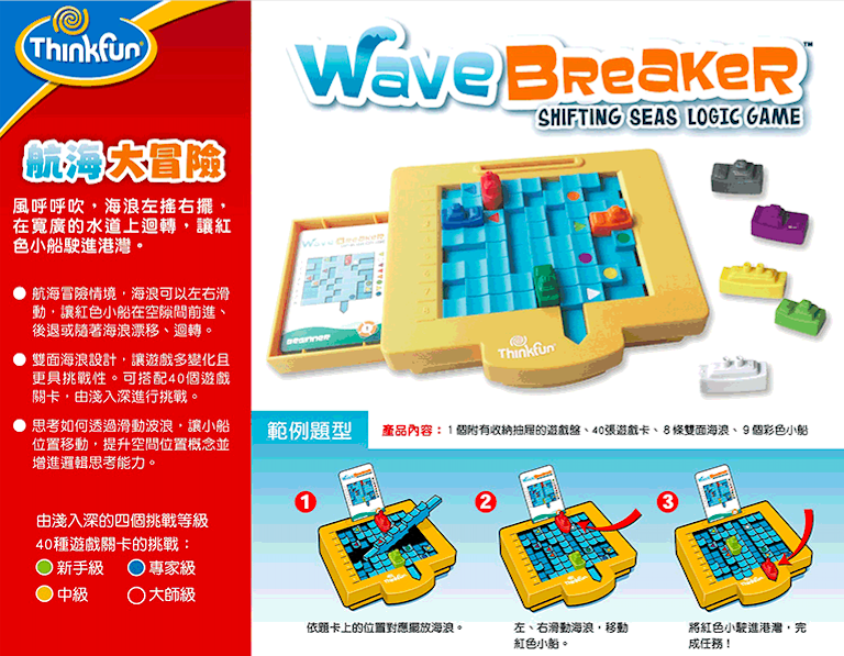 雙面海浪設計,讓遊戲多變化且更具挑戰性。可搭配40個遊戲關卡,由淺入深,透過海浪的左、右滑動,讓紅色小船在空隙間前進、後退或隨著海浪左、右漂移。當遇到寬廣的水道,還可以180°轉向前進。在遊戲中提升空間位置概念並增進邏輯思考能力。