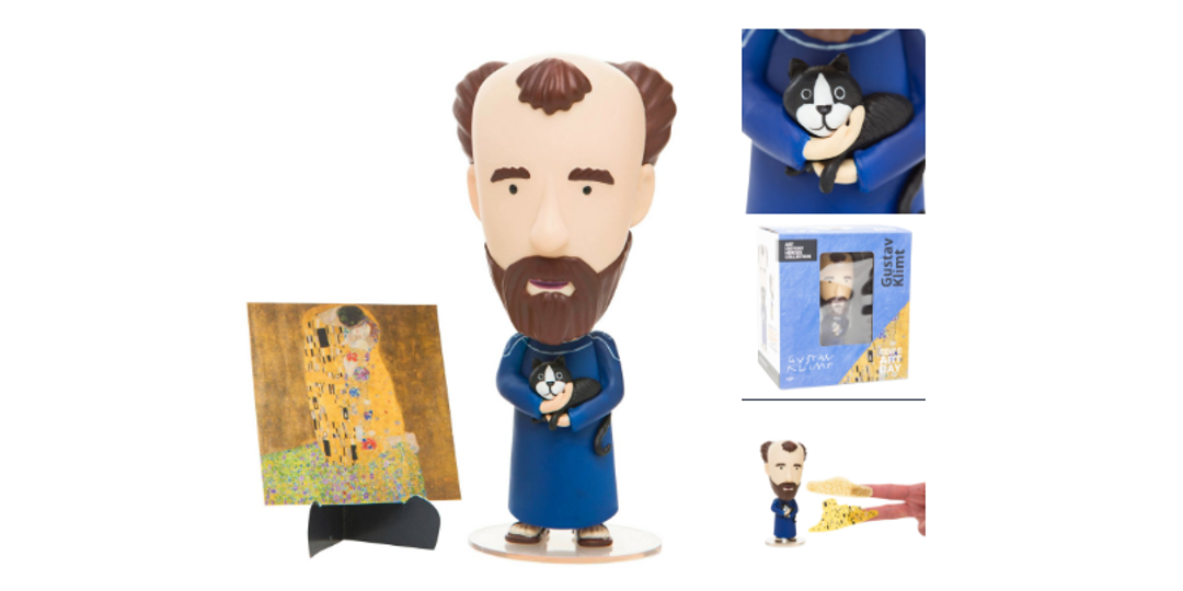 克林姆Q版公仔穿上標誌性的藍色長袍,懷抱著他那同樣出名的貓(Katze)。 隨公仔附送2張可重複使用的貼紙,圖案源於克林姆作品的巔峰“金色時期”經常使用金箔的畫風,可以貼在藍色長袍上做裝飾。