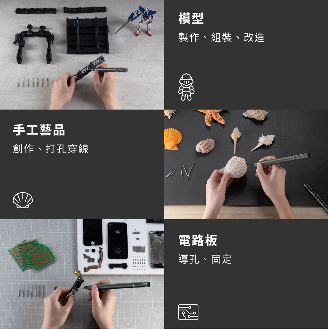 想在模型上鑽孔加上金屬配件,或在手工藝品上打洞做成吊飾,卻總是遇到重重困難:一個個手鑽手好痠、傳統電鑽又大又重不好操作、微型電鑽往往需要插著電使用等等…