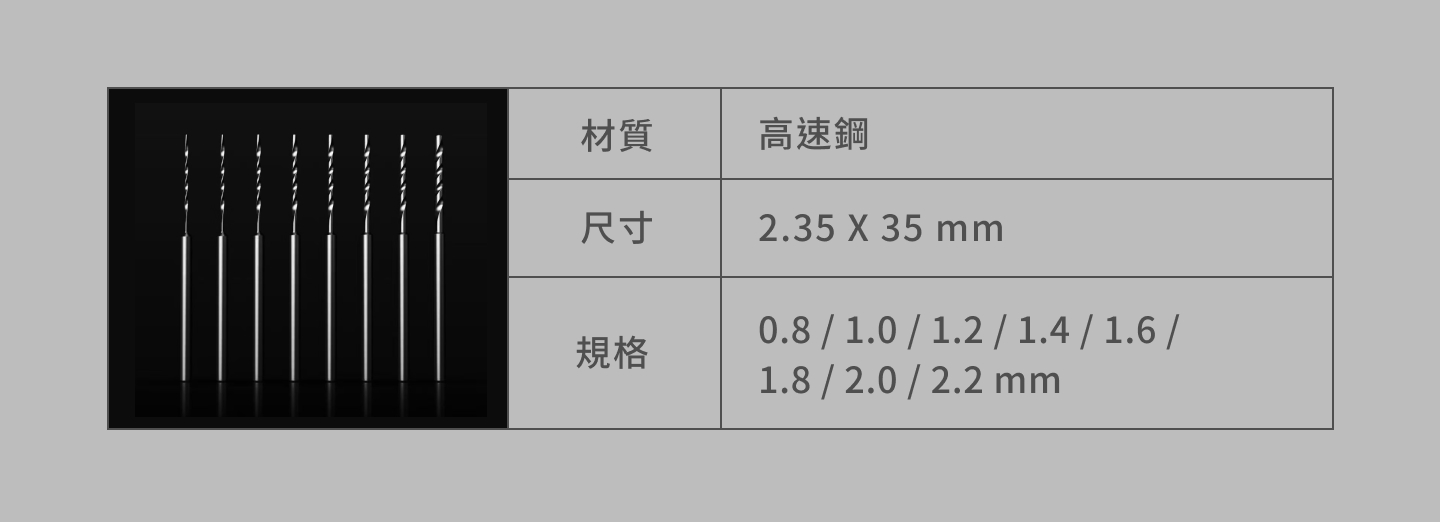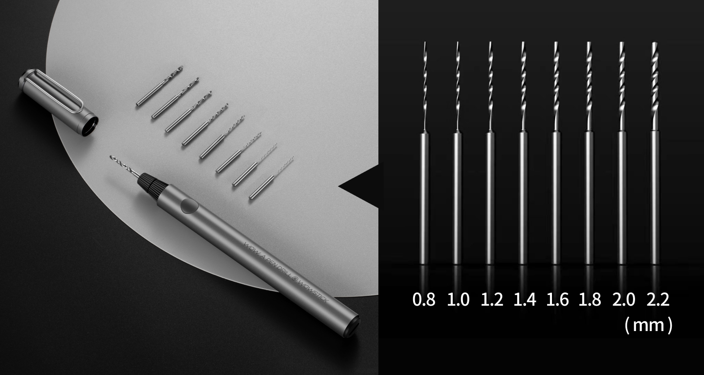 Wowstick Drill 隨附 8 支可替換的高速鋼鑽頭,具有高硬度、耐磨、抗高溫的特點,無論你喜歡模型或愛好手作,都能找到最適合自己的尺寸。此外,Wowstick Drill 的夾頭可夾持柄徑為 2.35mm 的鑽頭,因此你也能在市面上找到其它規格相同的鑽頭來交替使用。