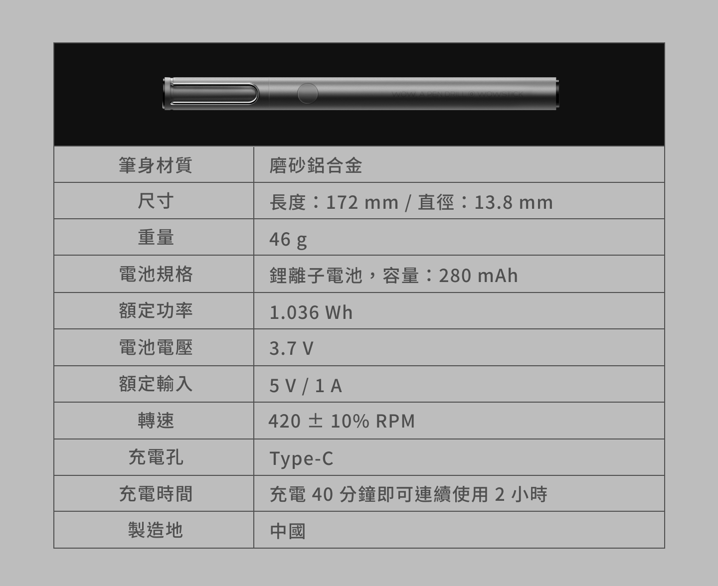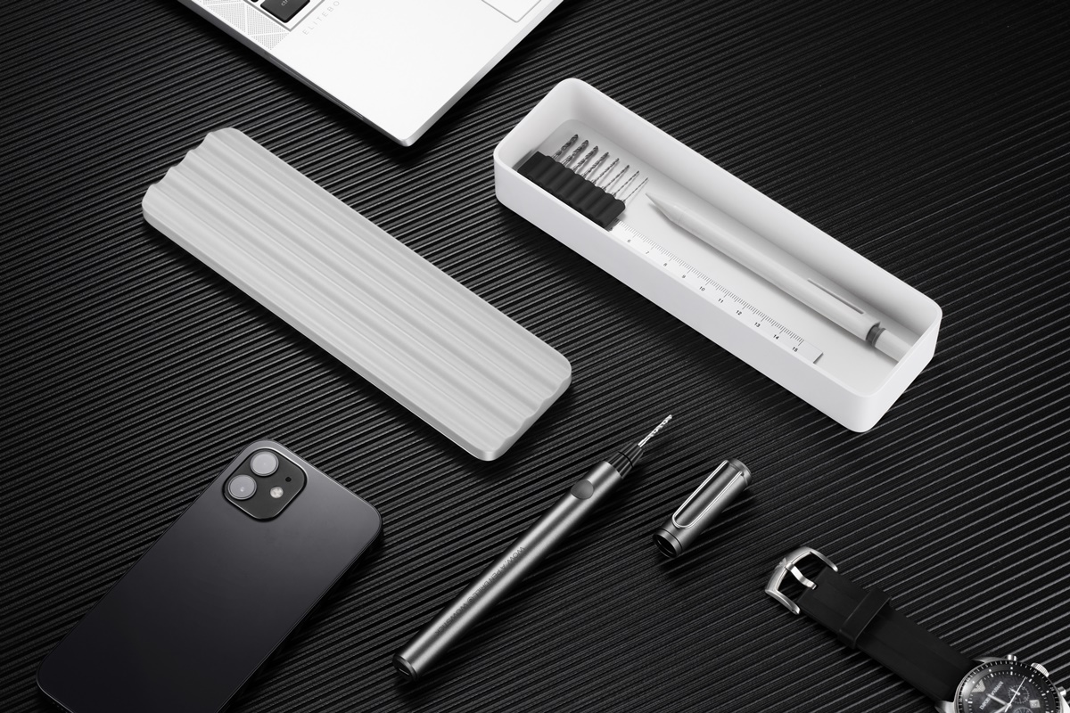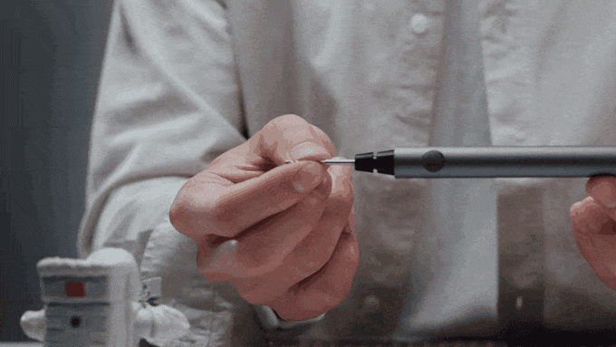 有別於設計粗獷的傳統電鑽,Wowstick Drill 採用一體成型的筆狀設計,磨砂金屬質感的筆身上沒有任何多餘的開關與配件,只要打開筆蓋、握緊筆身、對準目標,即可一鍵按壓操作。在按鈕部分使用矽膠材質,讓整體結構更加穩定,按壓時也相當舒適不卡卡。